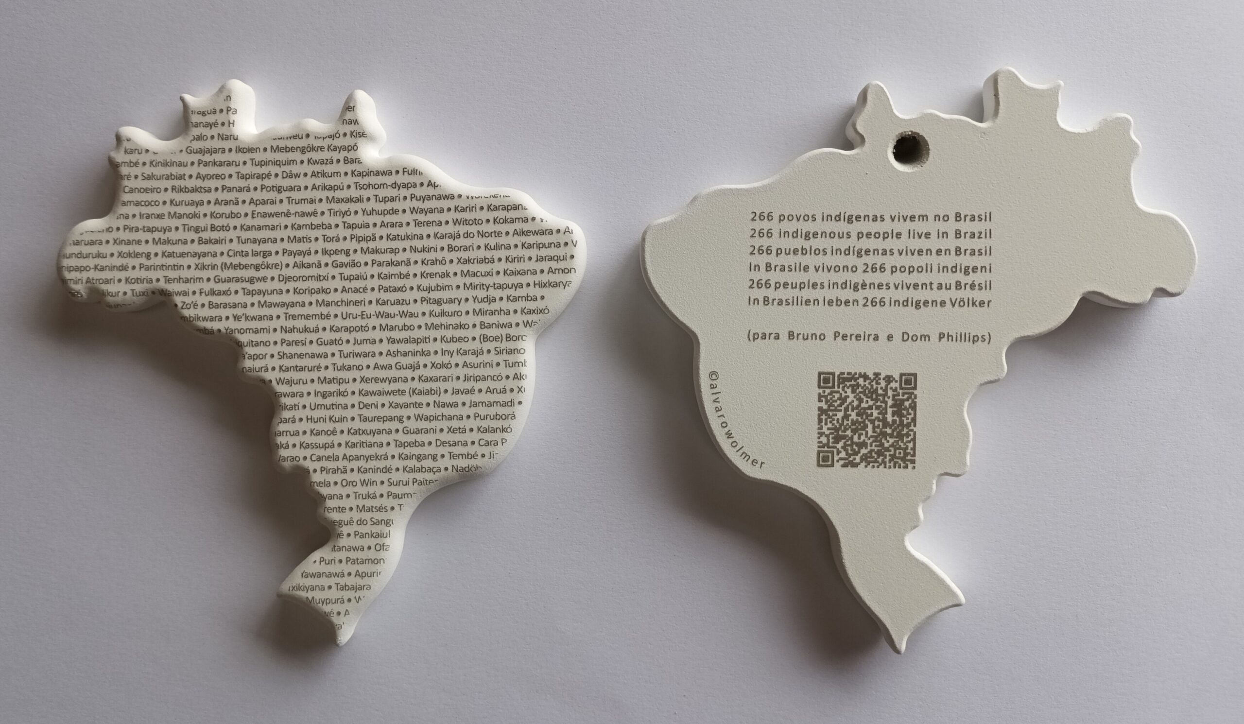 No verso, a frase “266 povos indígenas vivem no Brasil” está gravada a laser em 6 línguas. O código QR conduz ao recenseamento desses povos; seu nomes, suas populações e a região em que vivem.