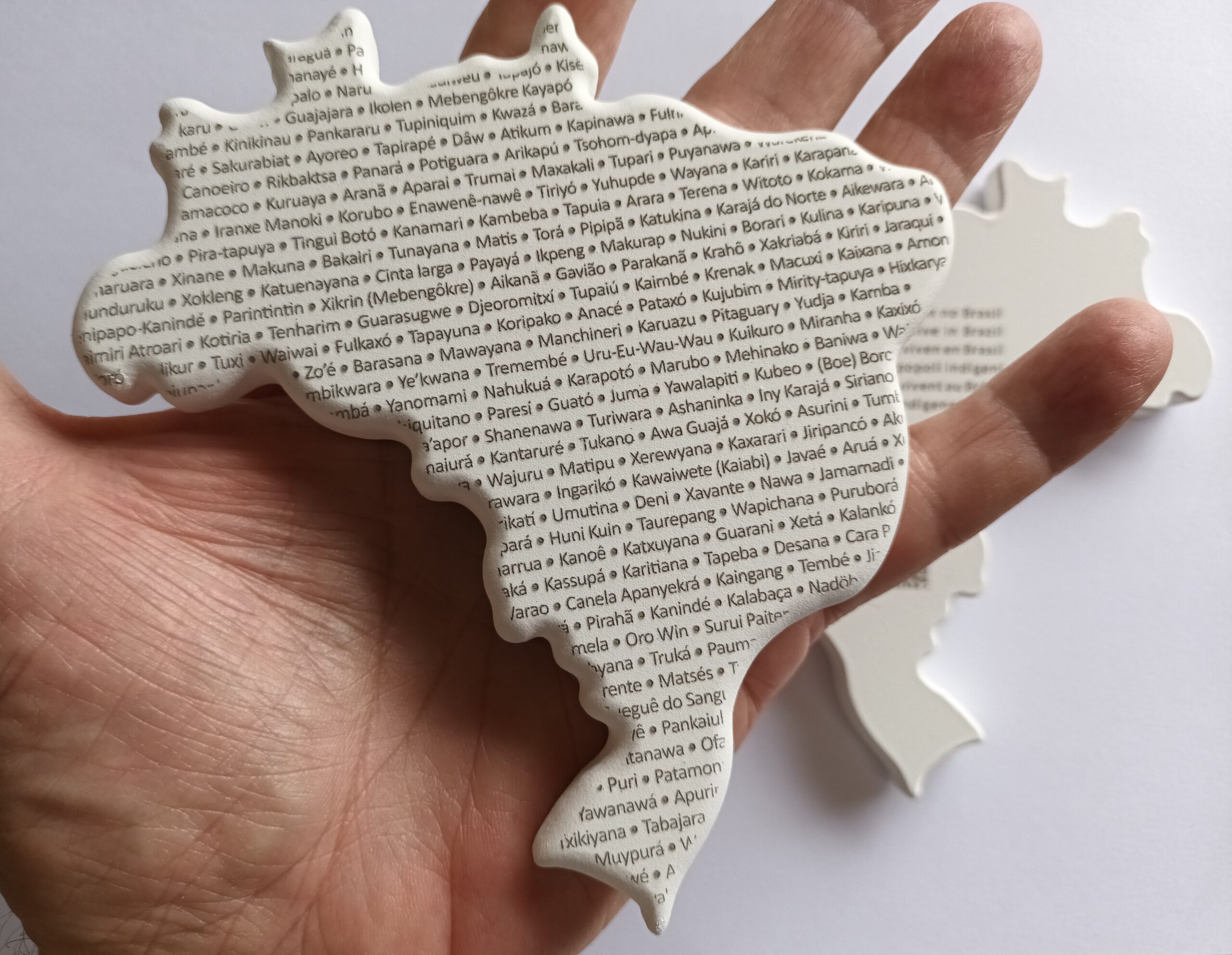 Mapinha do Brasil em MDF naval pintado em branco texturizado, com gravação de nomes dos povos indígenas que aqui vivem.